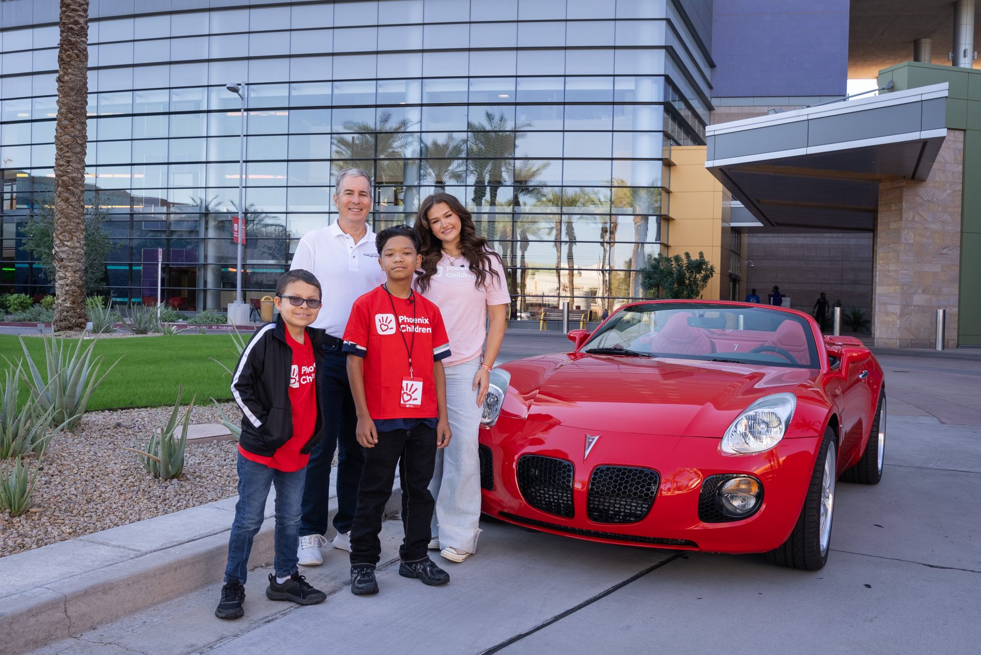 Congrats to the young Patient Design Team who collaborated on the transformation of this 2007 Pontiac Solstice GXP! Several months ago, the kids sat in a conference room and came up with a plan for this car, and today their vision is complete. They chose the exterior wrap color, interior leather, stitching and trim colors, stereo/AV options, floor mat style and several other bits and pieces. Over the following months, more than a dozen generous sponsors donated materials, parts and labor to make their vision come to life. Last weekend, the kids were able to see the car with their choices implemented and they were thrilled with the transformation. Very soon, this car will be for sale with every penny going to the Phoenix Children’s Hospital Integrative Medicine Center. Thanks so much to everyone involved!!